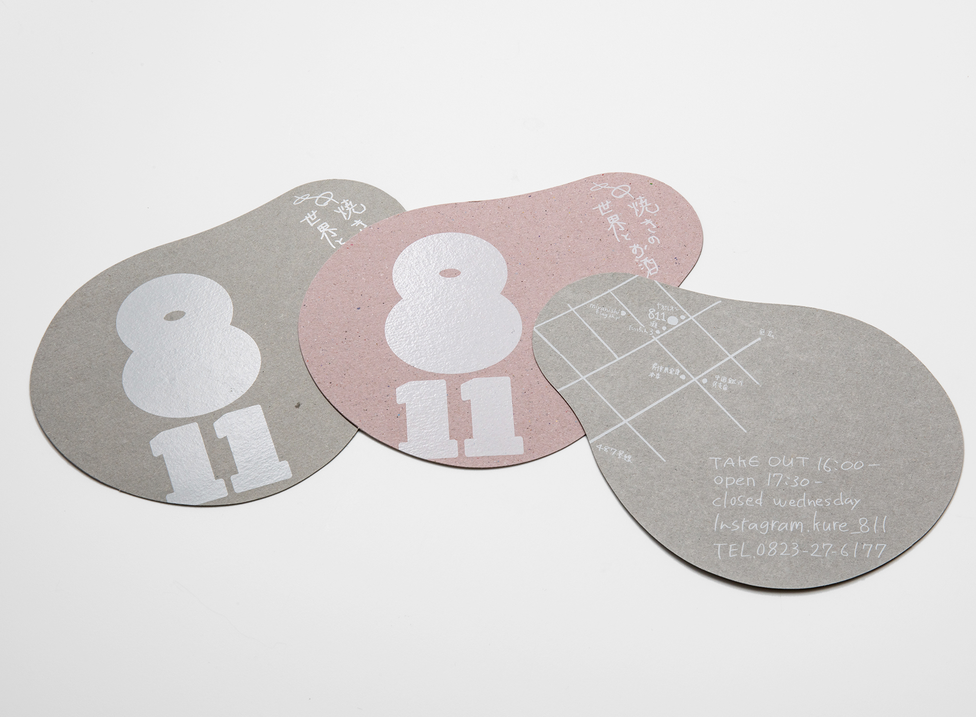 ロゴマーク、店舗手書きサインなど。店舗名「811」を使って焼き鳥屋さんを表現したロゴ。鳥の足が串に見えてくる。。至る所に現れる、荒々しい手書きの文字は直接マジックなどで描き、店主の男気や勢い、生々しい生命名力の強さ、を表現しています。