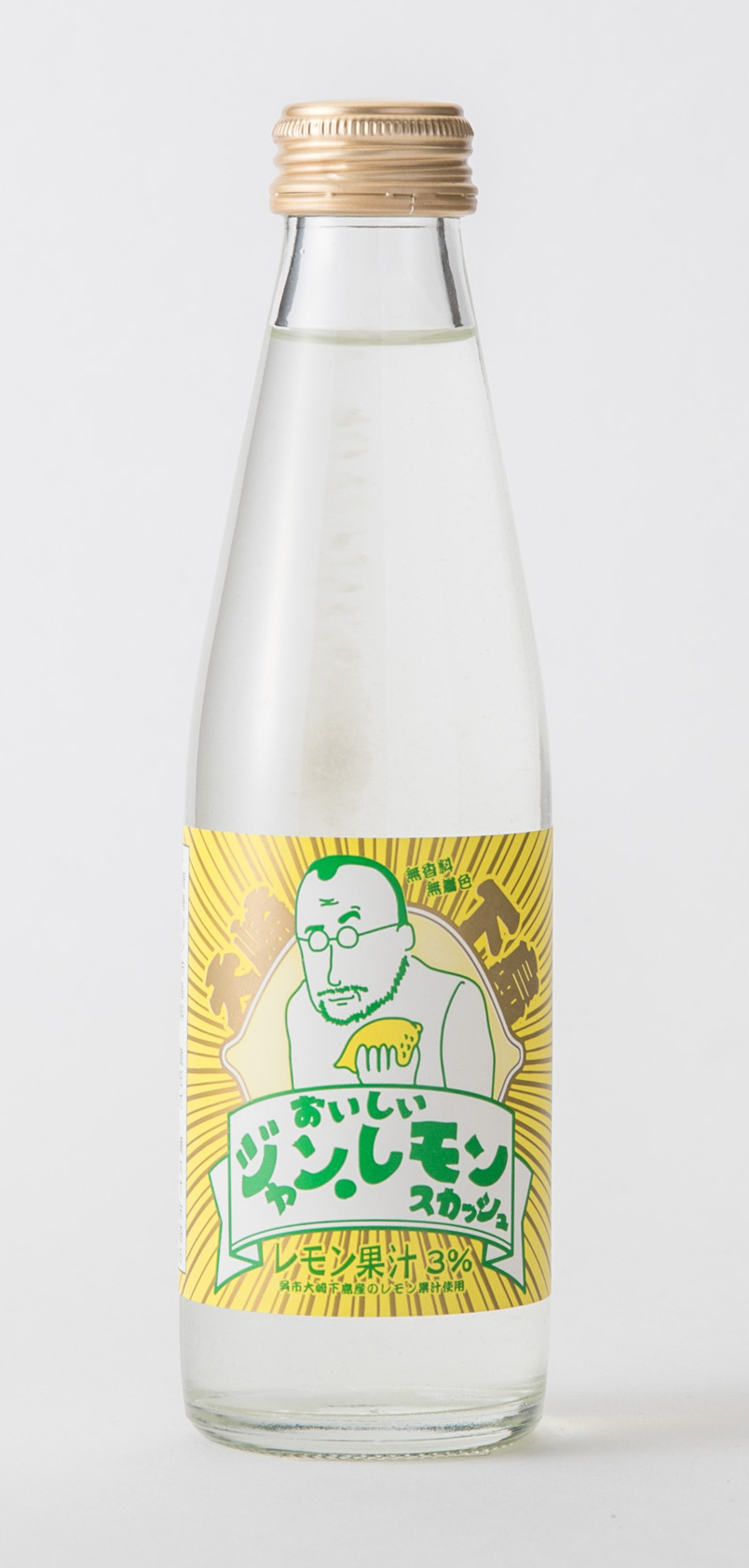 ジュースパッケージデザイン。ネーミング。島のジャン・レノと言われる人気者の農家さんが作るレモンスカッシュ。レモンから搾りまで全部彼が作るので、彼推しでデザイン。農家さんの顔を入れ、農家さんのニックネームを駄洒落にし商品名にしました。