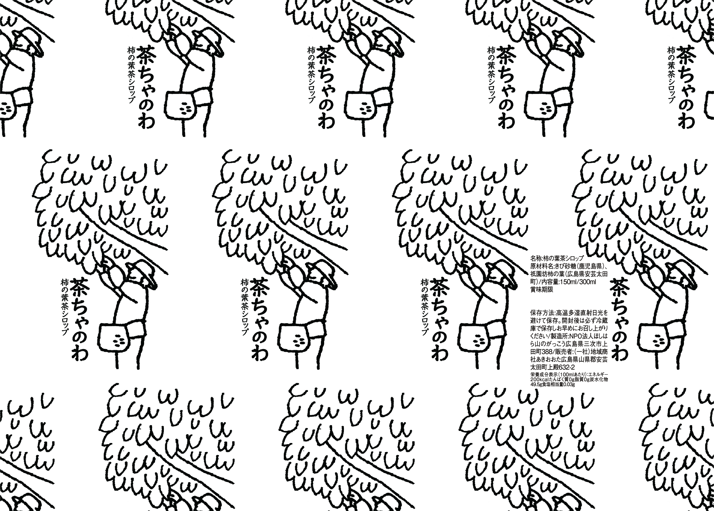 パッケージデザイン。安芸太田町の特産品「祇園坊柿」の葉をお茶にしたシロップ。香ばしくて優しい味です。地域を盛り上げようと「茶ちゃのわ会」さんがひとつひとつ丁寧に摘んで作り上げている商品。味のイメージが想像しにくい商品なので、大切に収穫している様子をそのままイラストにし、背景をダイレクトに伝えることで作り手の想いを感じてもらいやすいような、どこか懐かしく優しい気持ちになれるようにデザインにしました。