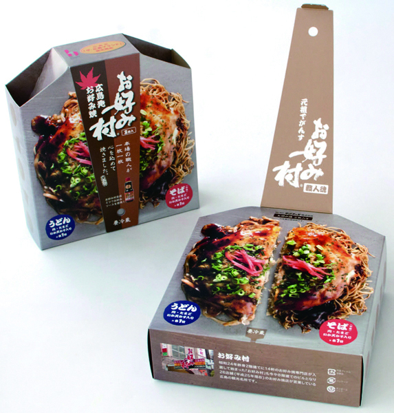 お土産用お好み焼きパッケージデザイン。広島人はお好み焼きを食べる時にヘラで食べます。その文化をそのまま持って帰って頂く為にヘラの形になるパッケージを設計しました。