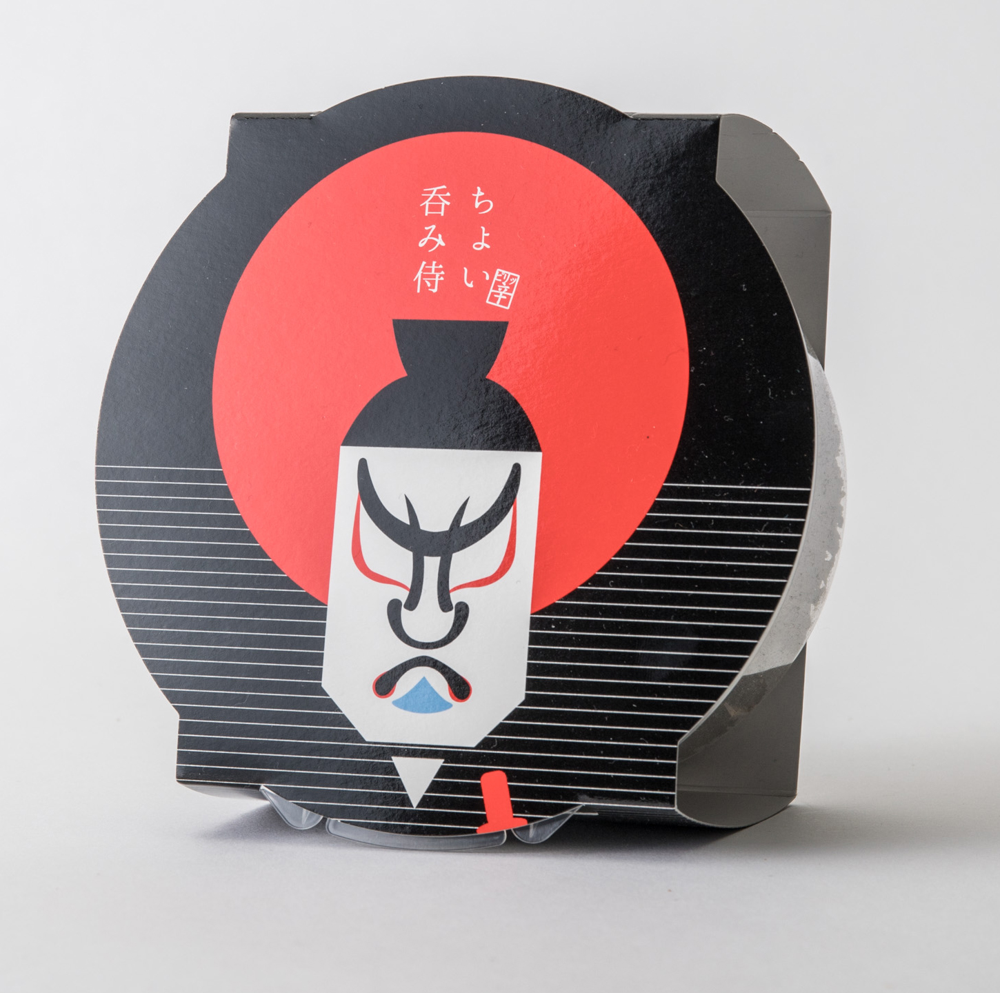 インバウンド向け海苔のパッケージデザイン。お酒のおつまみ用ピリ辛海苔なので辛味がわかるように赤色と海苔を連想させる黒の2色でシンプルに。日本酒のお猪口を頭に乗せて、ちょんまげにしました。