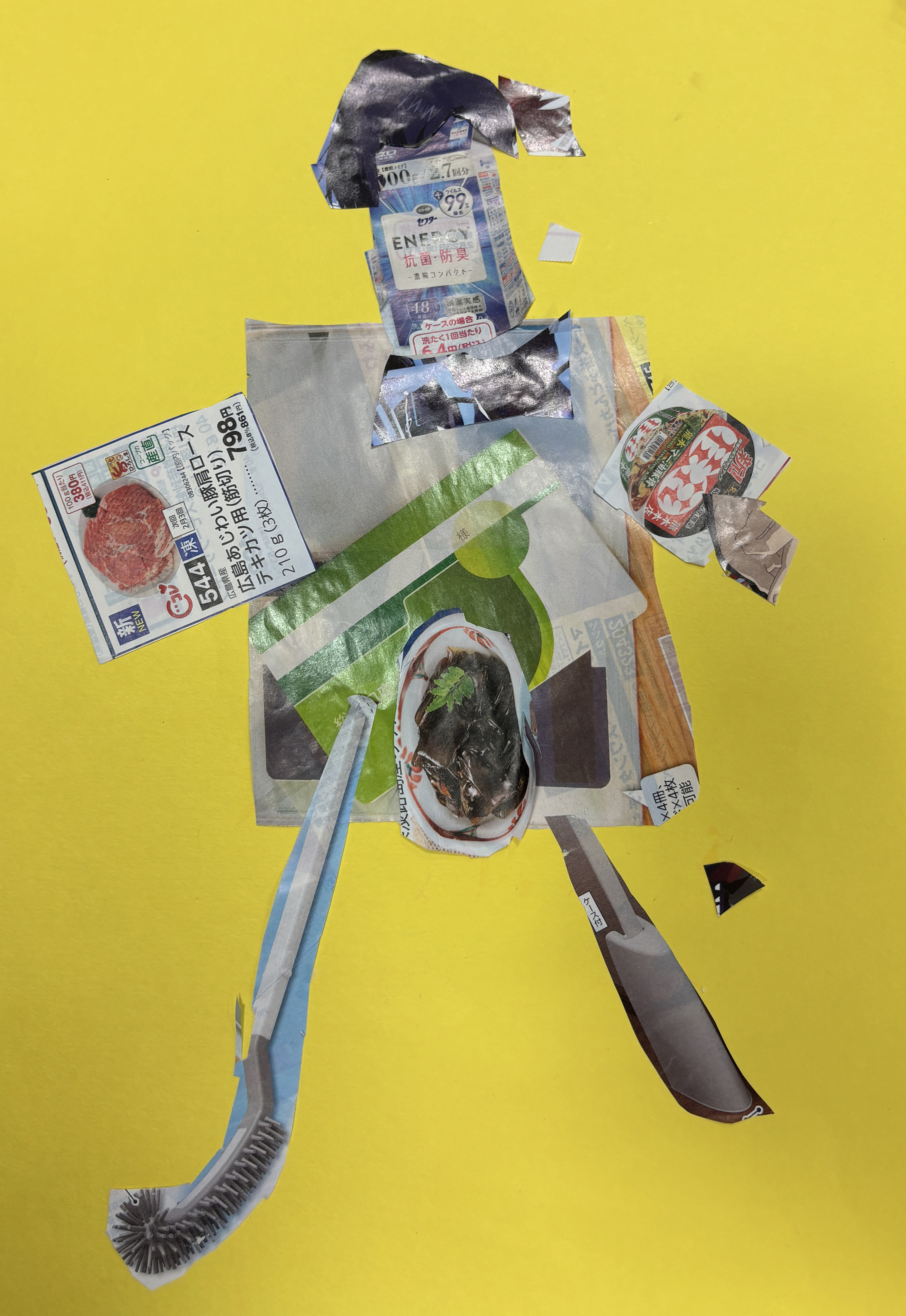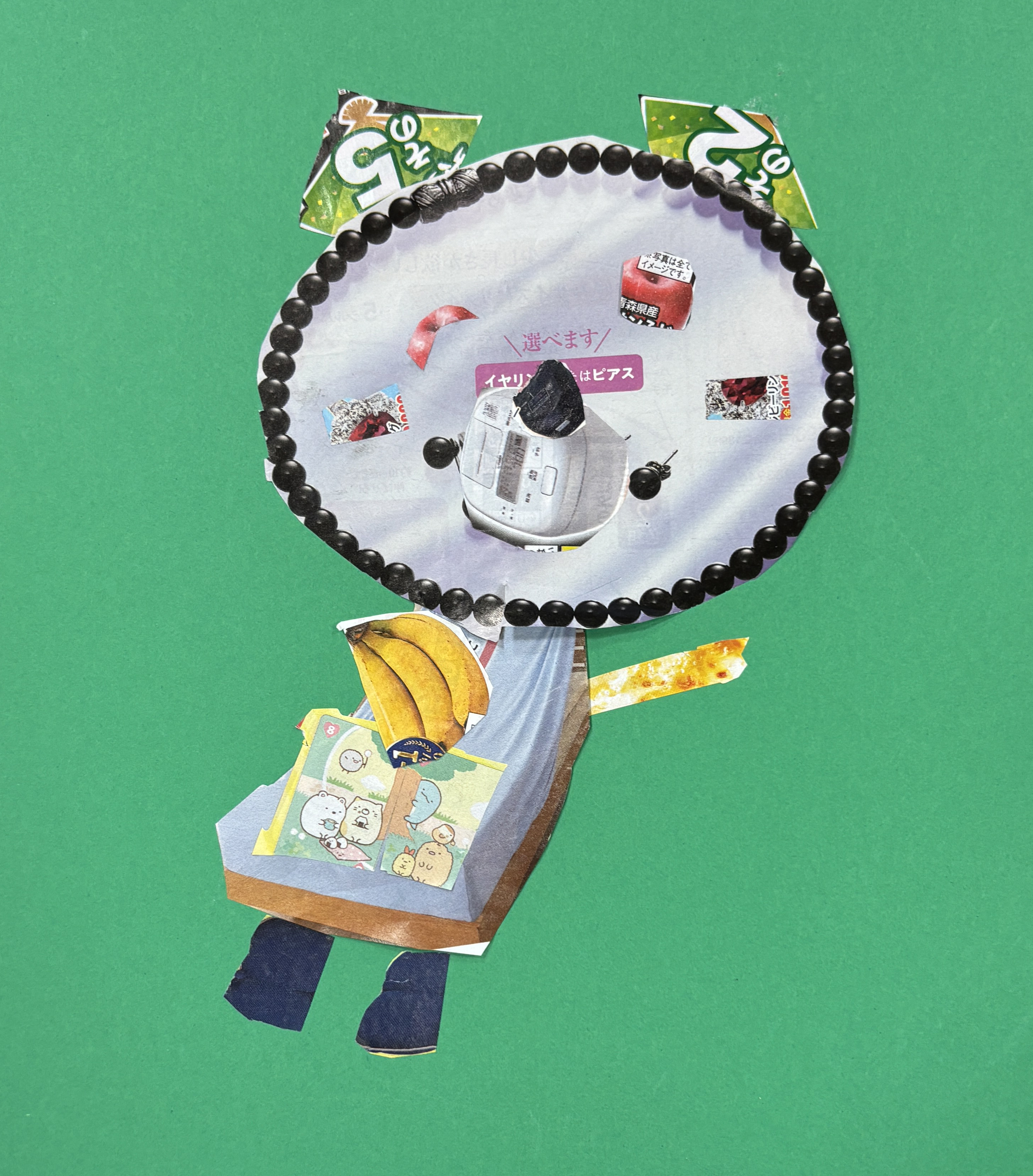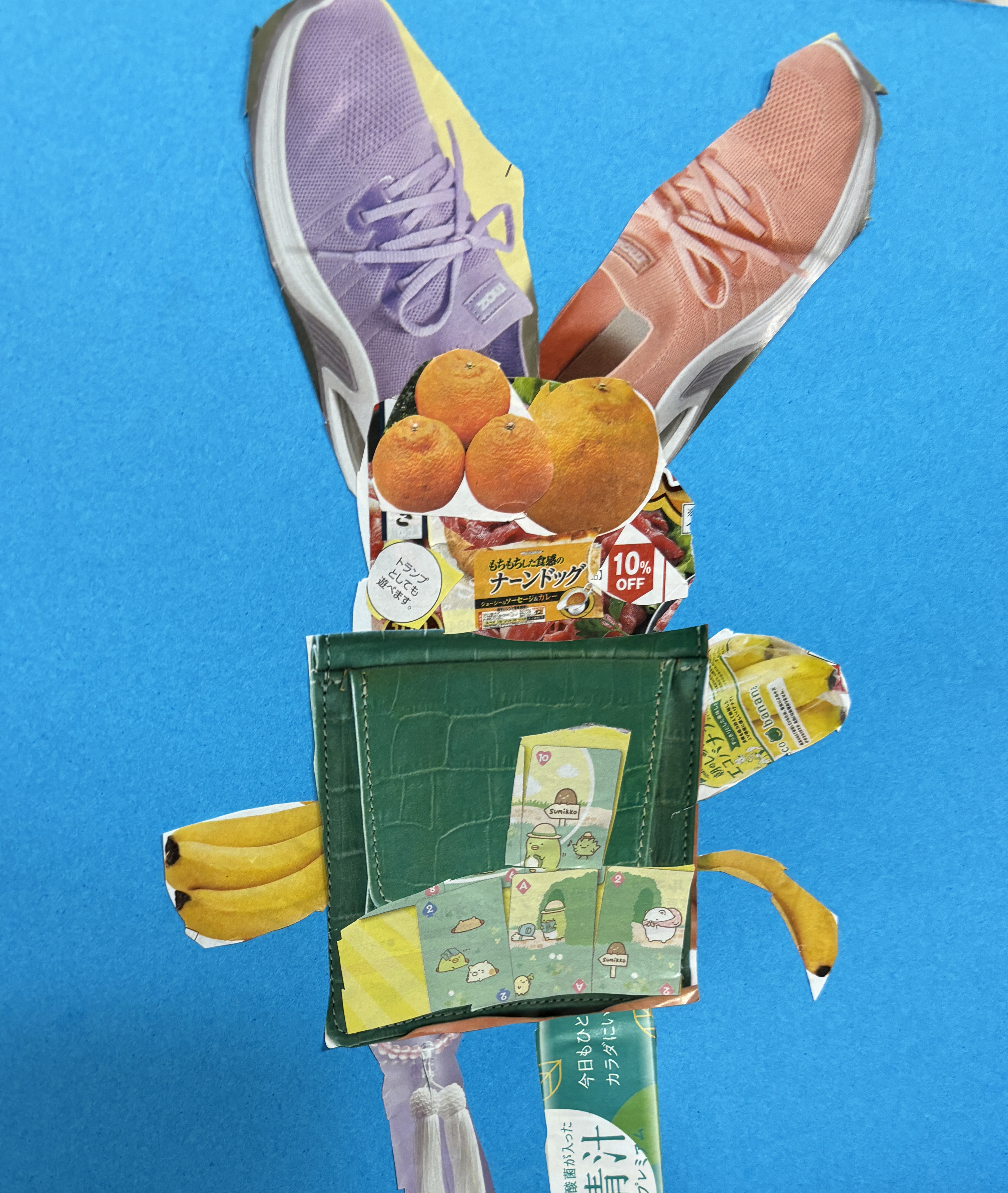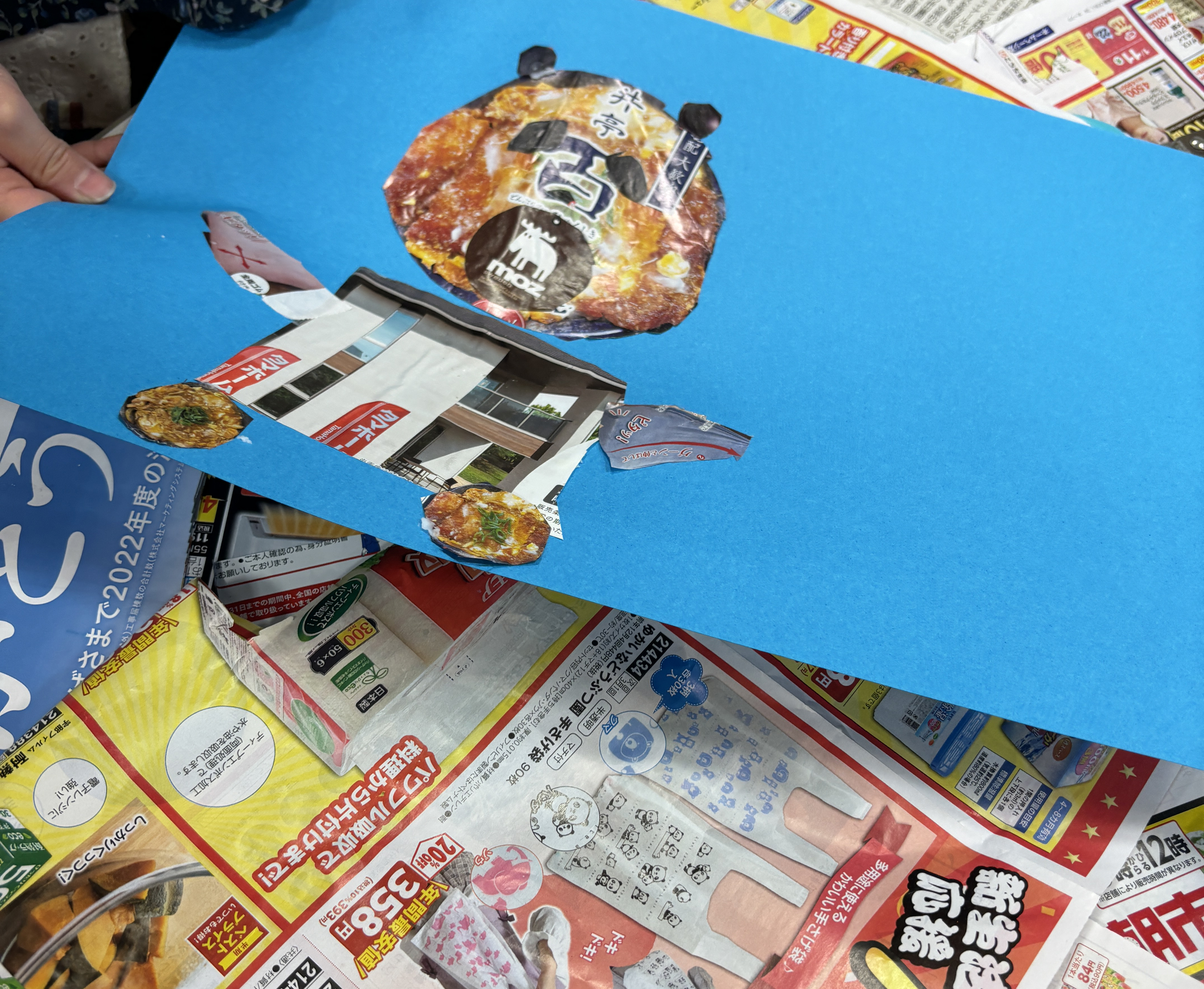 小学生向けワークショップ。コラージュ動物。真剣にチラシを見て、想像して、切ってみて、イメージ通りか試してみて作り上げる想像動物。